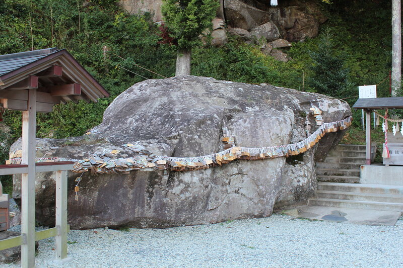 En la plaza más allá de la puerta torii hay una enorme roca que se cree que es una diosa, y sobre ella se sienta una enorme roca redonda que mide 14 metros de circunferencia que se cree que es un dios masculino, como si estuviera suspendido por una cuerda sagrada