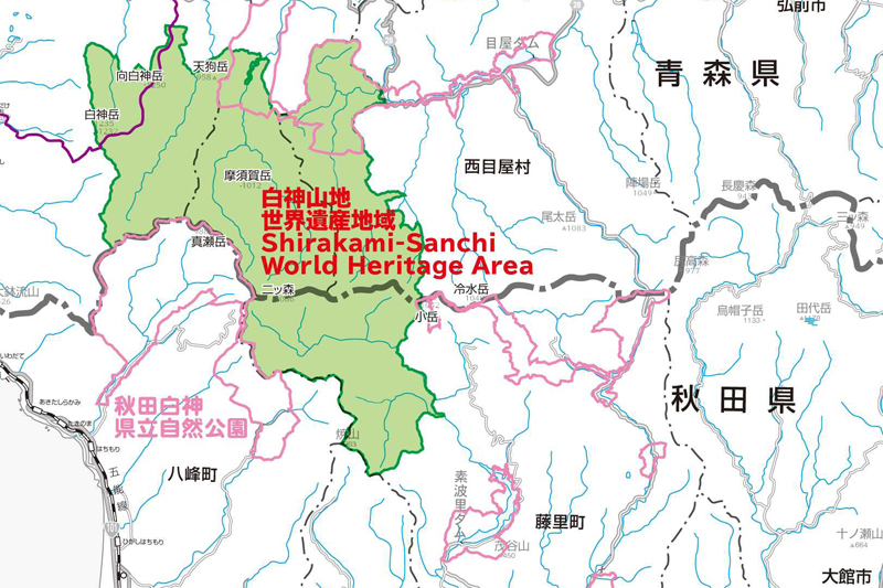 De la vasta zona de Shirakami-Sanchi, la zona declarada Patrimonio de la Humanidad abarca aproximadamente 16.971 hectáreas a gran altitud, entre las prefecturas de Aomori y Akita, y está compuesta por bosque virgen, compuesto principalmente por hayas. La zona de Aomori (ciudad de Fukaura, aldea de Nishimeya) abarca aproximadamente 12.627 hectáreas, lo que representa el 74 % del total. La zona de Akita abarca aproximadamente 4.344 hectáreas, todas ellas ubicadas en la ciudad de Fujisato.
