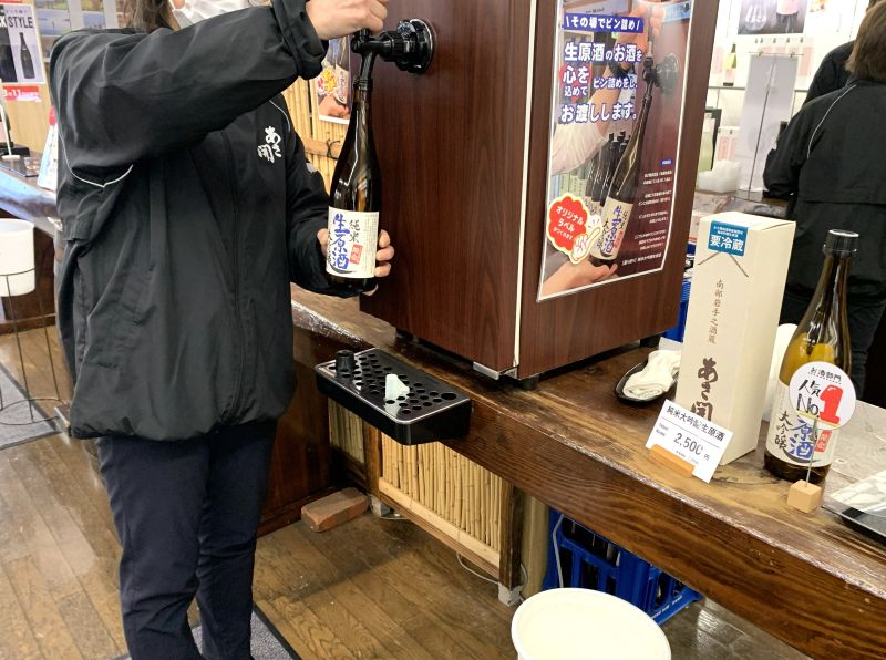En el centro local de productos de sake, puedes comprar sake sin pasteurizar que no está disponible en las tiendas por peso en botellas de 4 litros (740 ml: 2500 yenes), pero estoy seguro de que muchas personas se preguntarán: "¿Una botella de 4 litros no suele ser de 720 ml?"