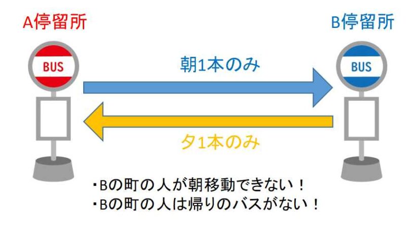 Cependant, si le service de bus devait circuler de l'arrêt A à l'arrêt B le matin et de l'arrêt B à l'arrêt A le soir, les habitants de la ville B ne pourraient pas utiliser le bus le matin, et même s'ils prenaient le bus du soir, il n'y aurait pas de bus de retour (cela ne serait pas un problème majeur si tous ceux qui se rendent au travail ou à l'école allaient uniquement dans le sens A vers B).