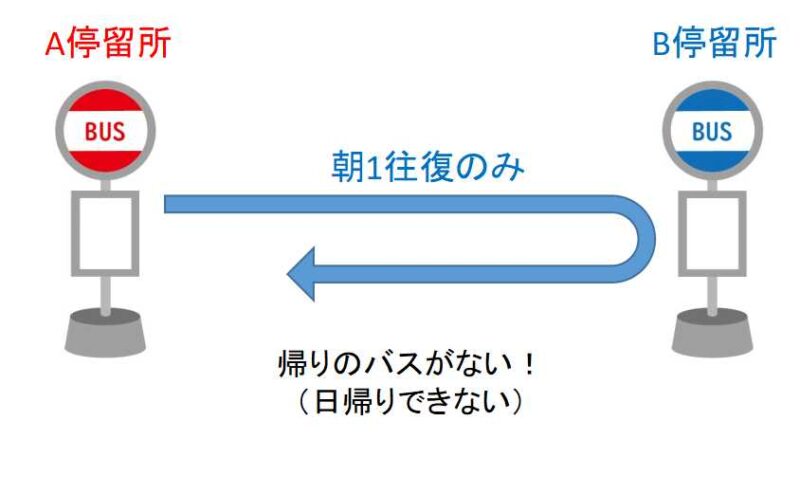 Par exemple, imaginons une ligne de bus qui ne circule qu'une fois par jour, reliant l'arrêt A à l'arrêt B puis revenant à l'arrêt A pendant l'heure de pointe du matin. Les personnes qui prennent ce bus ne peuvent pas rentrer chez elles le jour même . Elles doivent alors prendre un taxi ou se faire raccompagner par un proche.