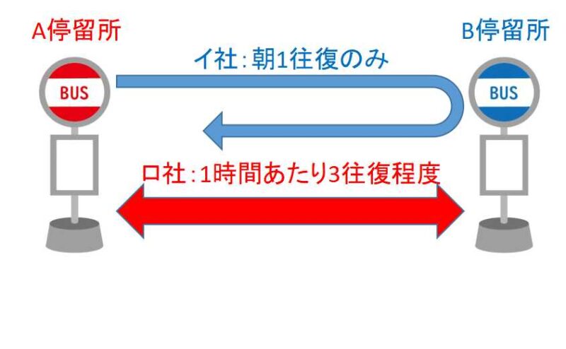 Cependant, cela ne signifie pas que les riverains aient subi le moindre désagrément. Une autre compagnie de bus (appelons-la compagnie B) exploite le même itinéraire que la compagnie A, effectuant environ 1 à 3 allers-retours par heure