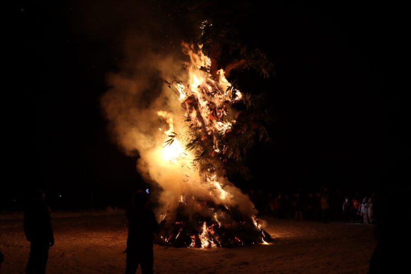 부활 전은 설동을 만들고 있었다고 합니다만, 부활 후에는 왈라로 오두막을 세우고, 정월 용품 등을 넣습니다. 우선은 가마쿠라 다이묘진을 제신으로 한 제단을 만들고, 신사를 하고, 그 후 오두막에 불을 붙입니다.