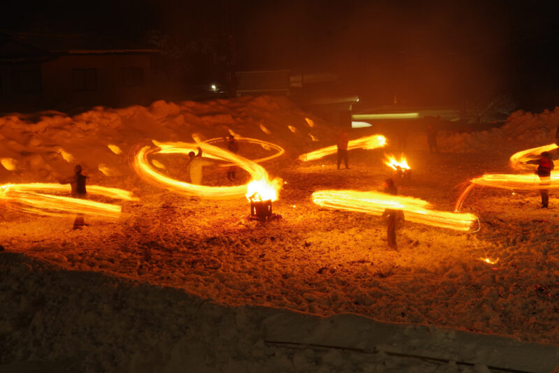 「 화진 가마쿠라」는, 각관의 겨울을 물들이는 전통의 행사입니다. 3m 정도의 왈라나와 끝에 숯을 묶어, 숯에 불을 붙여 원을 그리도록 휘두른다. 한겨울의 설경에 불꽃의 고리가 춤추는 환상적인 광경은 압권입니다.